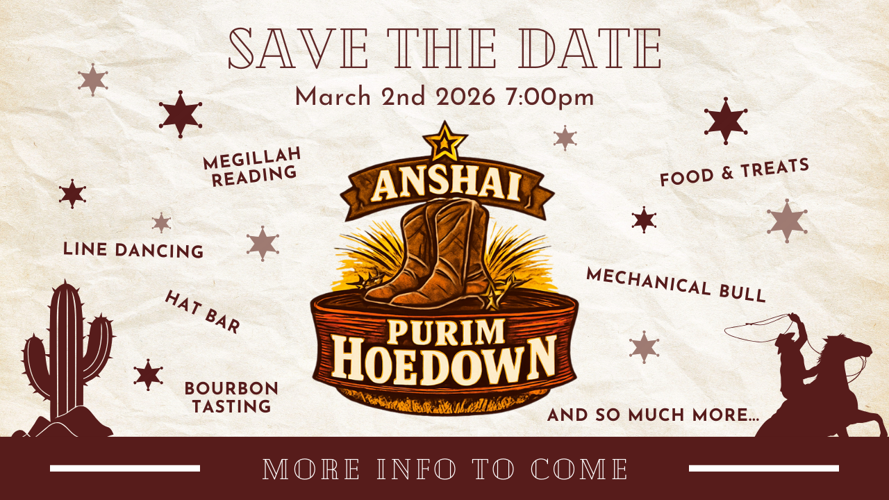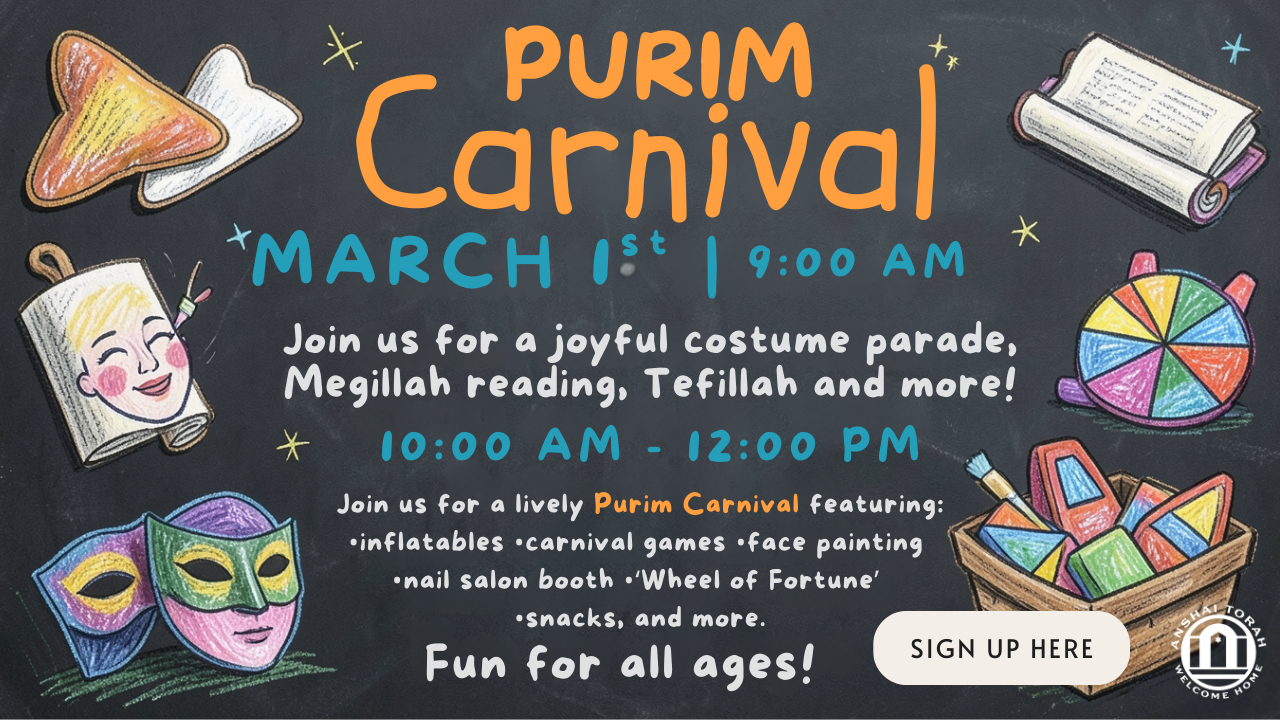 Enjoy a festive costume parade, Megillah reading, and tefillah, followed by a lively carnival from 10:00 a.m.–12:00 p.m. featuring inflatables, carnival games, face painting, a nail salon booth, Wheel of Fortune, snacks, and more. Fun for all ages—don’t miss this morning of laughter, tradition, and celebration!