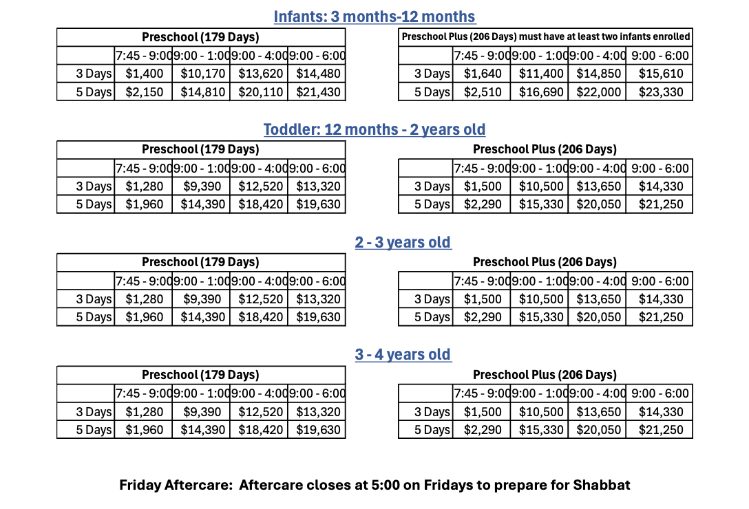 Friday Aftercare: Aftercare closes at 5:00 on Fridays to prepare for Shabbat