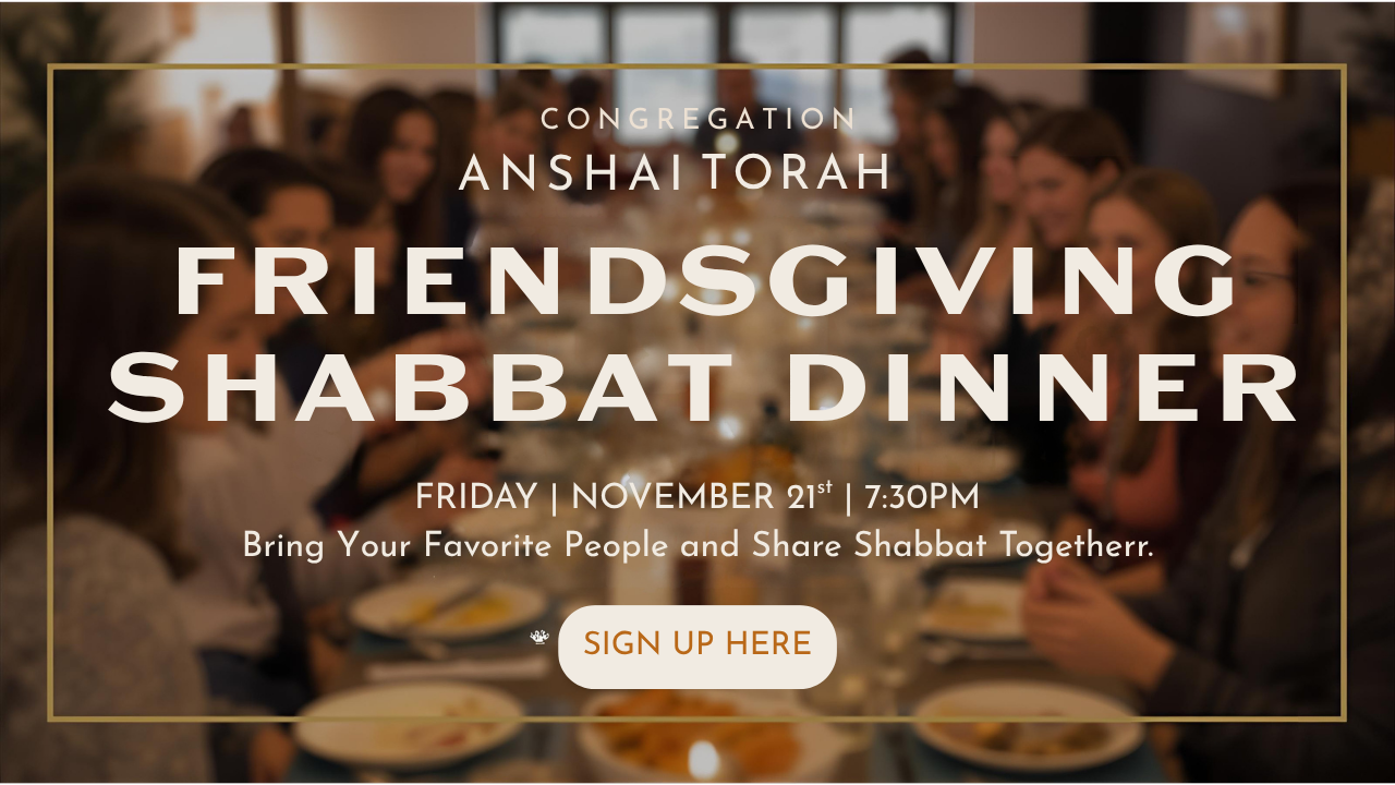 This year's theme is Oseh Shalom - Maker of Peace. We are excited to announce our honoree is none other than Anshai Torah's past president Beth Berk! As a member of the Anshai Torah lay leadership and throughout her tenure as synagogue president, Beth has always been a welcome and calming voice, a helping hand when needed and someone you could count on. Register Here to join us!
