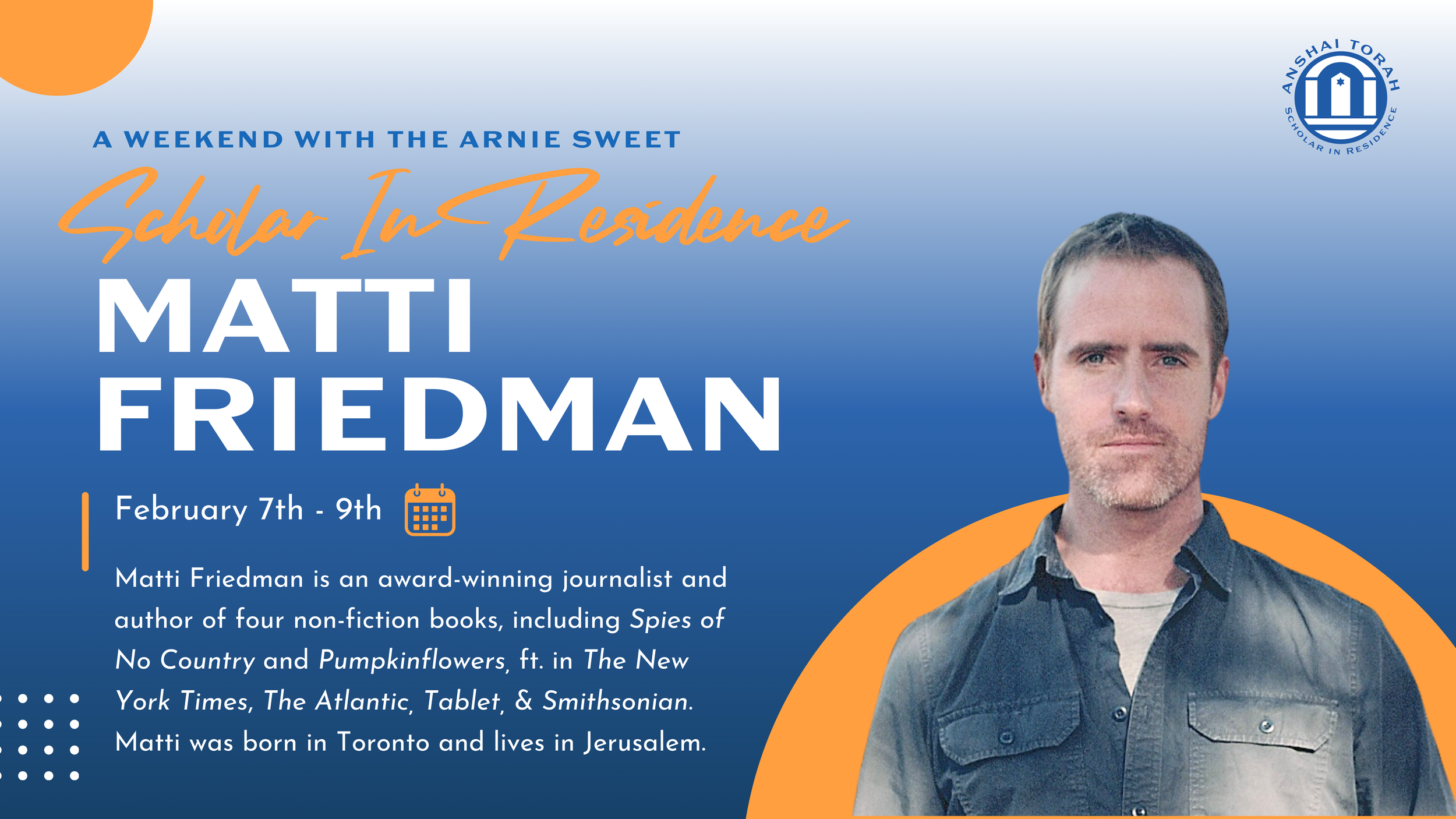 Join us for a captivating weekend with Matti Friedman, award-winning journalist and acclaimed author of Spies of No Country and Pumpkinflowers. Featured in The New York Times, The Atlantic, and Smithsonian, Matti brings unique insights from his life in Jerusalem and Toronto.