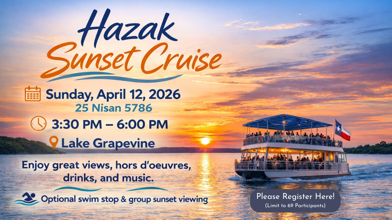 Join us on Sunday, April 12th, at 3:30 p.m. for Hazak's annual sunset cruise on Lake Grapevine. Enjoy some great views, each other's company, hors d'oeuvres, drinks, and music by DJ Supreme.